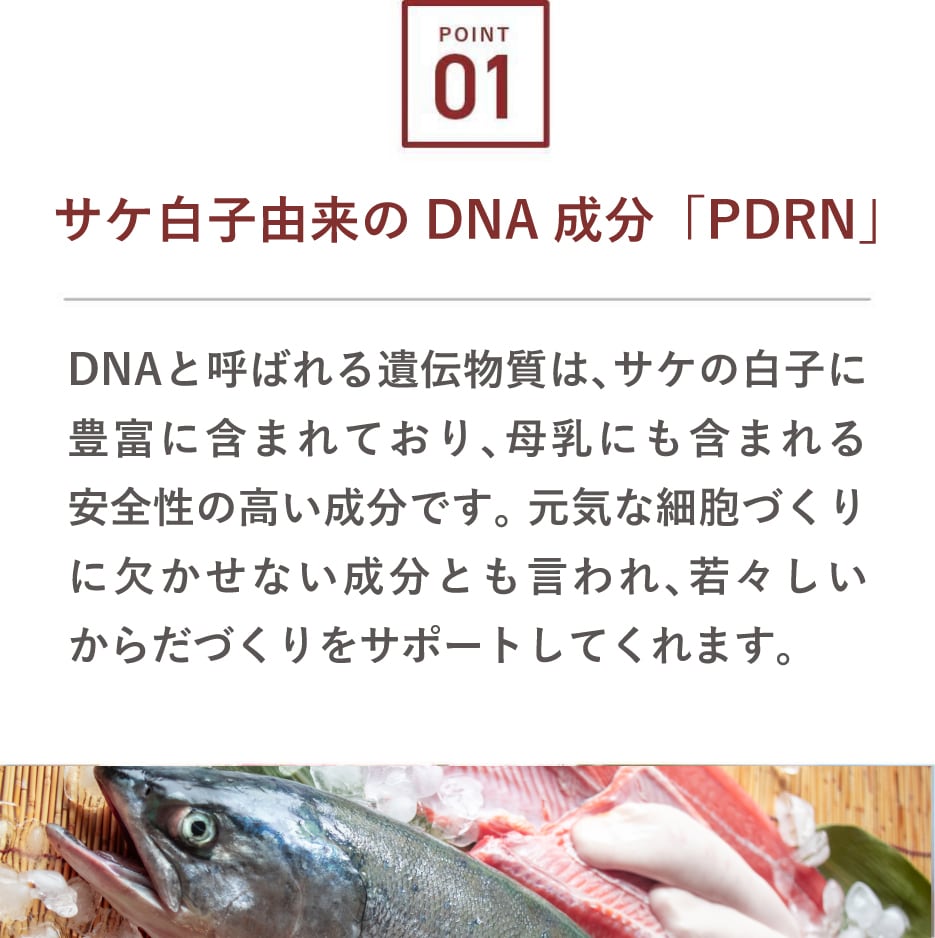 サケ白子由来のDNA成分「PDRN」は、美容医療のサーモン注射にも使用されていますが、分子が大きく肌に浸透しにくいという課題がありました。そこで独自の酵素処理により本来の力を損なうことなく低分子化し、肌への浸透性※を高めた北海道産サケ白子由来PDRNが、経済産業省・北海道大学・酪農学園大学との連携により開発され、多くのスキンケア製品や、手作り化粧品のレシピの材料に選ばれています。着色料・香料無添加